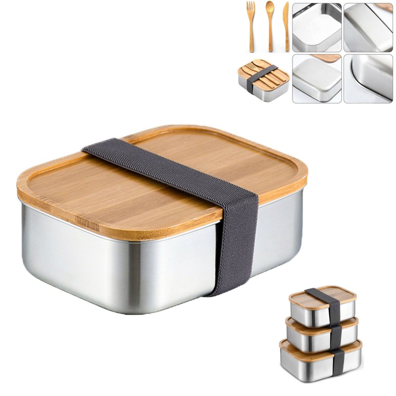The lunch box comes with a food-grade stainless steel body and a premium wood lid. You can customize the logo or name.